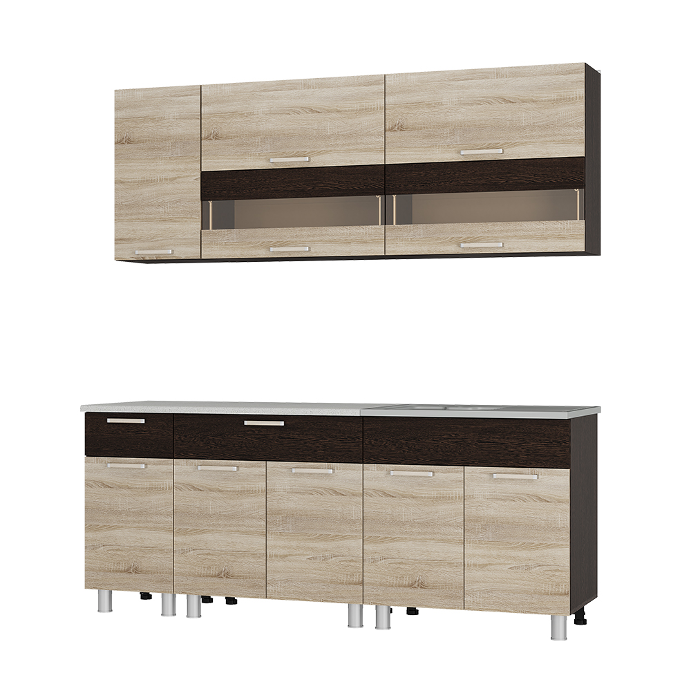 Кухня Монтана шириной 2м, включает в себя 2 нижних шкафа шириной 800мм, 1 нижний шкаф с ящиком - 400мм, 2 верхних шкафа со стеклом шириной 800мм, 1 верхний шкаф - 400мм.